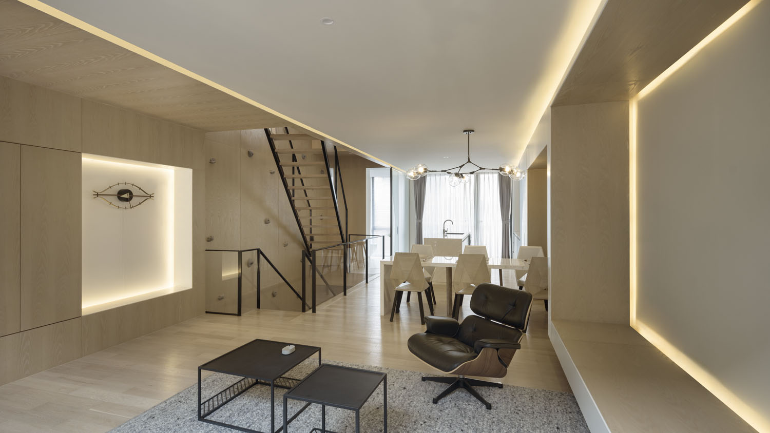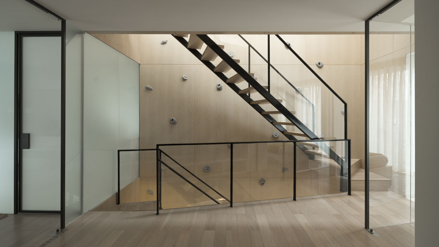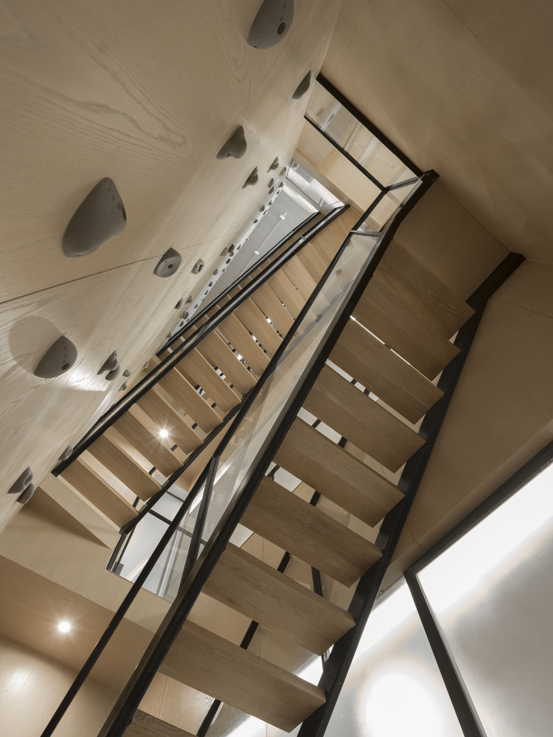 正如在盒墅项目的设计过程中,我们将整个别墅纵向切分为左、右两个层次:左侧虽以楼梯、洗手间等实用功能为主串起了四层居家场景,同时为了避免空间的乏味感,我们“玩”出了一个轻透且略带偏转的楼梯,并由此产生了一面约9米高的攀岩墙;右侧基本上每层空间都代表了一个时间段的生活舞台,自下而上从众乐到私享,每个空间的情感氛围也有着耐人寻味的差异。