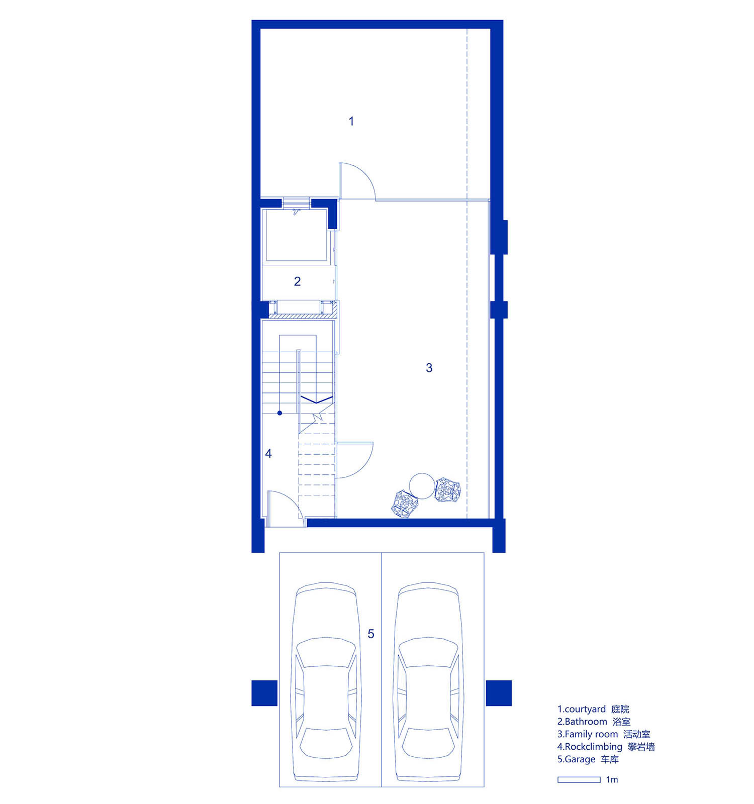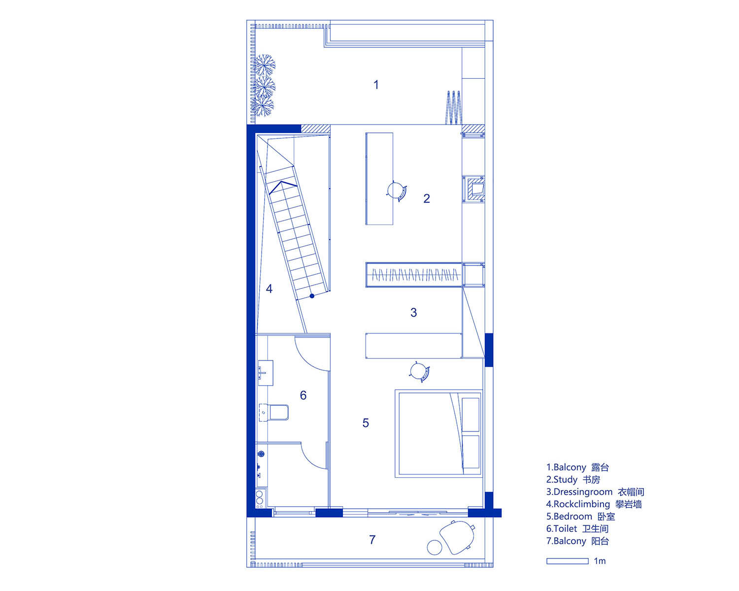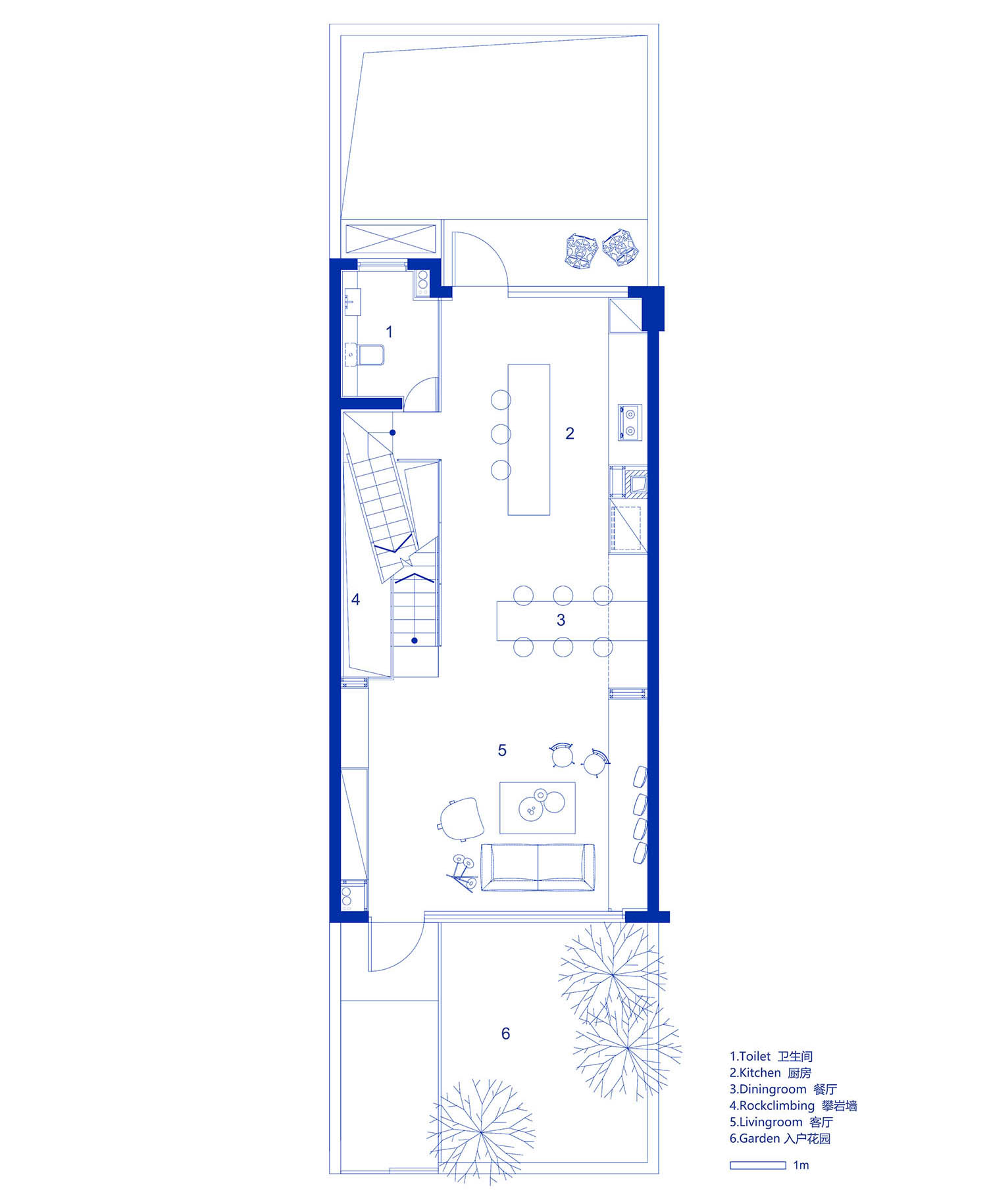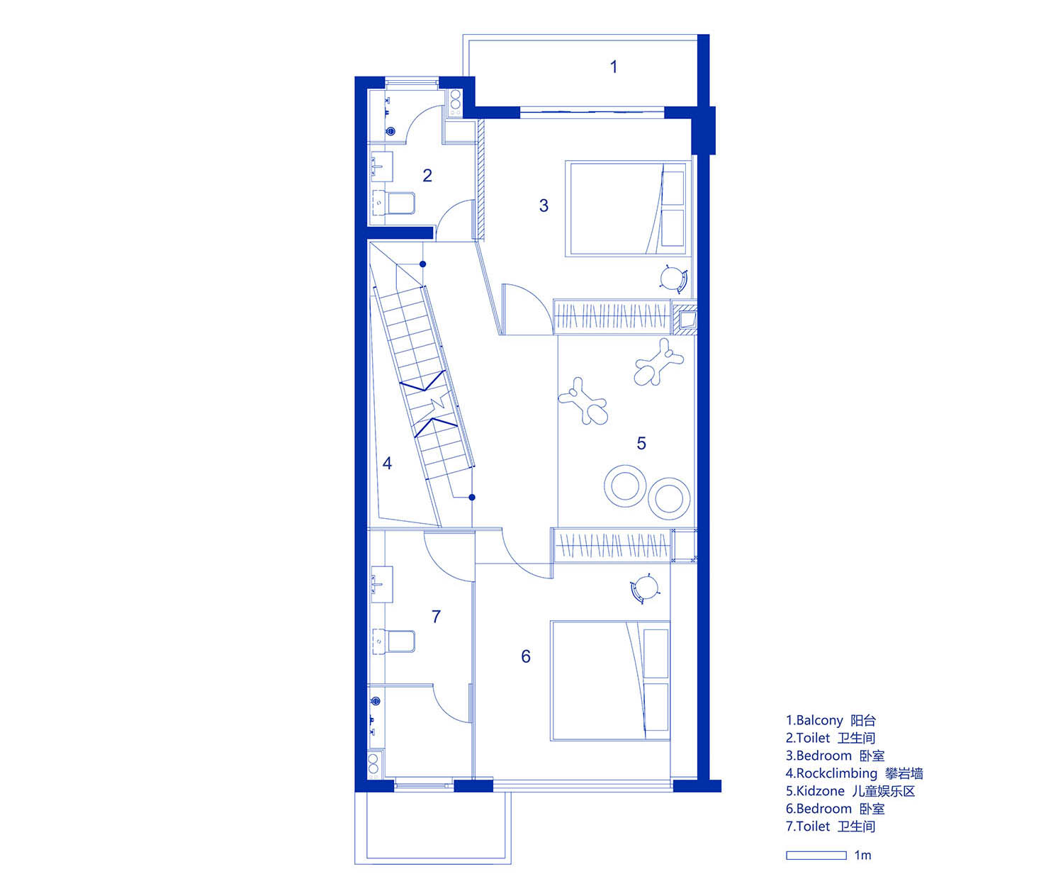 正如在盒墅项目的设计过程中,我们将整个别墅纵向切分为左、右两个层次:左侧虽以楼梯、洗手间等实用功能为主串起了四层居家场景,同时为了避免空间的乏味感,我们“玩”出了一个轻透且略带偏转的楼梯,并由此产生了一面约9米高的攀岩墙;右侧基本上每层空间都代表了一个时间段的生活舞台,自下而上从众乐到私享,每个空间的情感氛围也有着耐人寻味的差异。