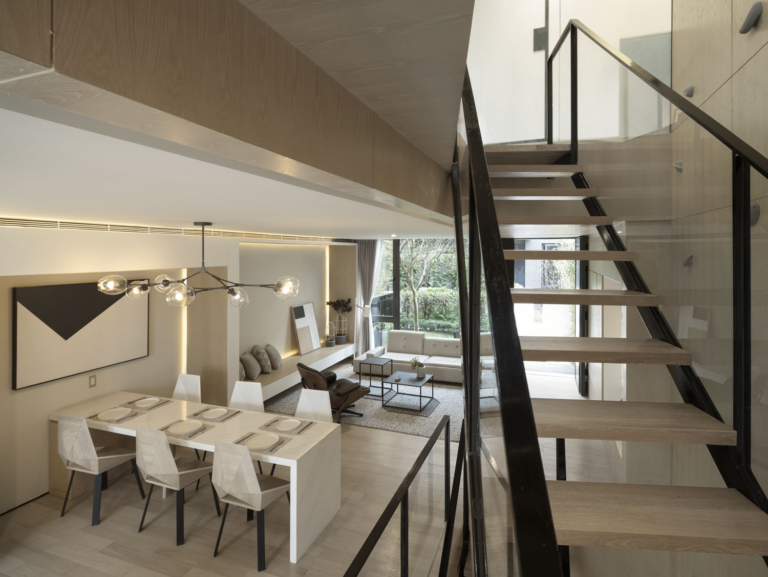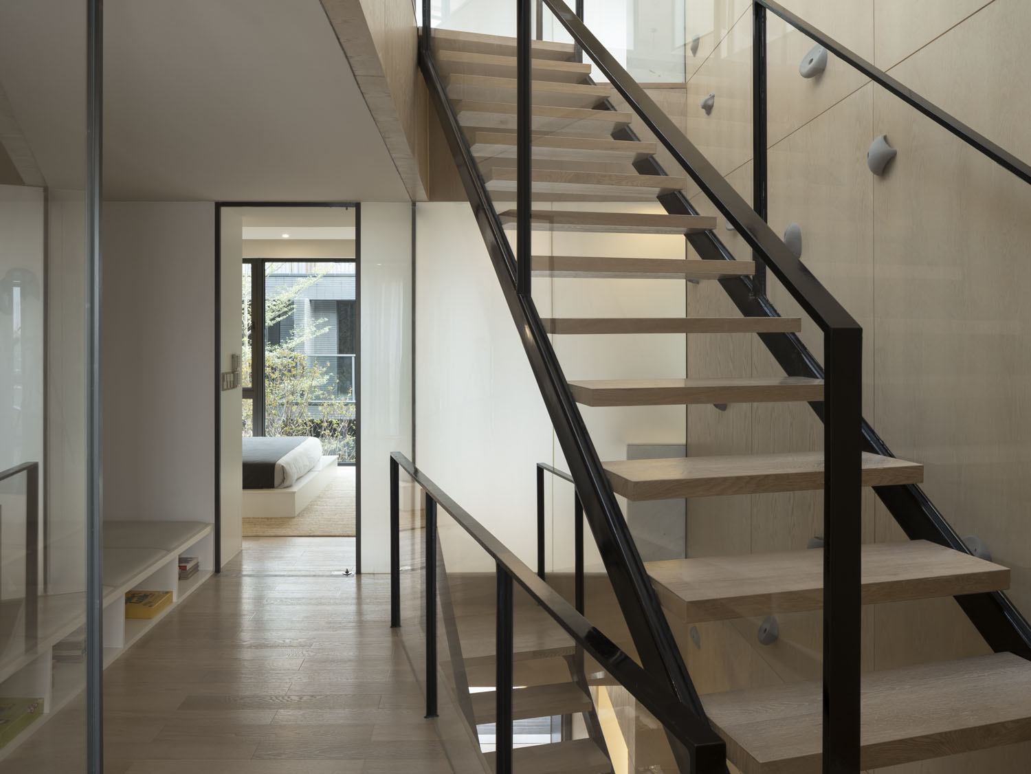 As in the design of the Linked House, we divide the entire villa longitudinally into left and right parts. On the left side, a series of four-story home scenes are set up based on practical functions such as stairs and bathrooms. At the same time, in order to avoid the boring sense of space, we "played" a light and slightly deflected staircase, which created a climbing wall about 9 meters high. On the right side, each space basically represents a stage of life in a time period. From the bottom up, from open to private, the emotional atmosphere of each space also has intriguing differences.